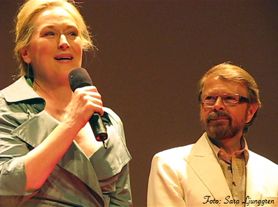 2008-07-04: Galapremiär för “Mamma Mia – the movie” på Rival i Stockholm. Alla var där! Glöm inte att dra på volymen ordentligt när du lyssnar på soundtracket till “Mamma Mia – the movie” med Meryl Streep, Stellan Skarsgård och Pierce Brosnan m.fl. Lyssnar du riktigt noga kommer du att hitta min röst i varenda låt eftersom den svenska orginalensemblen fick i uppdrag att lägga alla körer. Otroligt kul att få se Meryl Streep och alla de andra på nära håll! Här en bild från introduktionen före filmen, Meryl håller tal: